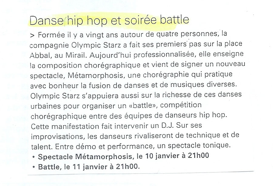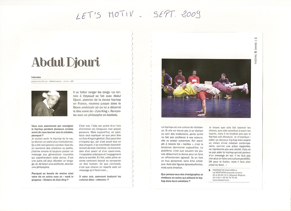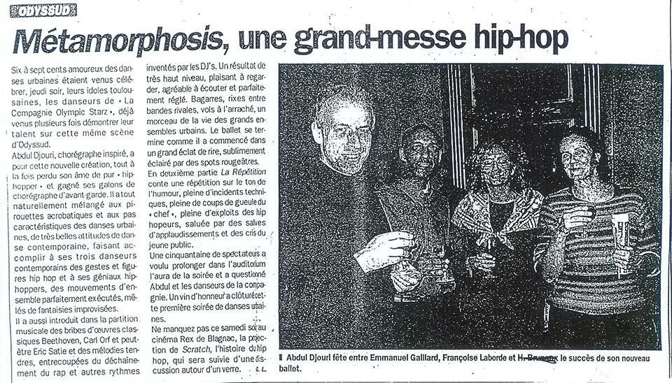 Pionnier de la danse urbaine en France, Abdul Djouri s’est lancé dans cette aventure en 1982, en mettant en place des entraînements et des rencontres avec des danseurs de différents quartiers de Toulouse. En 1987, il crée la Compagnie Olympic Starz qui propose des créations chorégraphiques présentées dans le monde entier. En 2001, il monte le CACDU - le Centre d’Art Chorégraphique en Danses Urbaines - et acquiert la reconnaissance des institutions. Il propose alors des spectacles avec la Cie Olympic Starz dans de grandes salles comme La Villette, Festival URB (Helsinki), Sardaigne, Mexique...